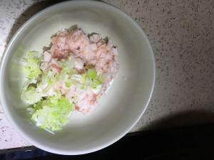 将剁好的猪肉中加入切碎的大葱末和姜末,再加入一小勺盐、味素、麻油、料酒搅匀和成肉馅