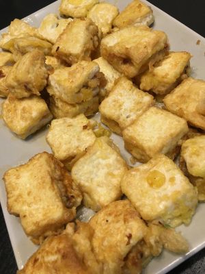 炸到金黄色,感觉豆腐变大了,有气孔了,就可以了