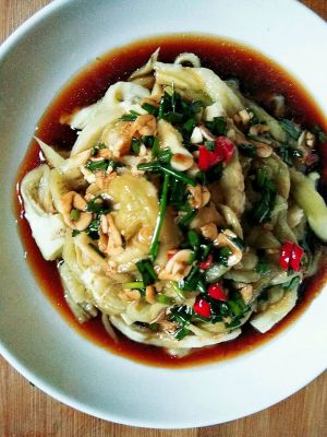 把锅里倒入油(也根据个人平时炒菜时候的油量),油七成热倒入盘中,材料尽量放在茄子中间,这样将油倒在材料上,味道好。 一道凉拌茄子就做成了!