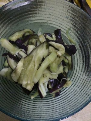 把茄子洗净,切条,放入盘中,用保鲜膜把盘子封上,在保鲜膜上用牙签扎几个眼,放入微波炉转上5分钟。(盘子一定是微波炉专用)