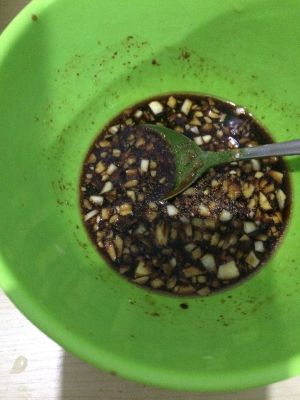 调蒜汁,大蒜切碎放入生抽,醋,香油,白糖拌匀