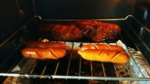 然后把它放进已经放了锡纸铺低(预防汁弄脏烤箱难清洗干净),已经上下管道调为200℃预热了15分钟的烤箱,把烤箱持续上下管道保持200℃,第一次开烤15分钟。