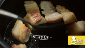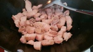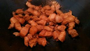 油锅内放入姜片,冰糖,后放入五花肉,进行煸炒,加料酒后盖上盖子;