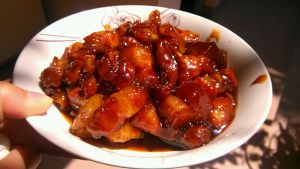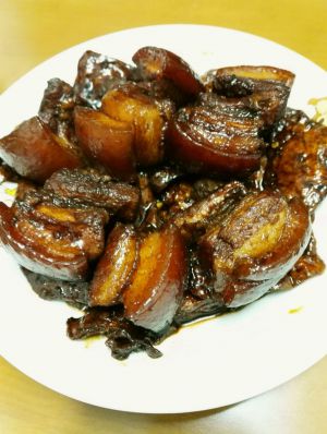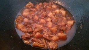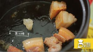 用筷子能轻松插入肉里时放入冰糖,多少可根据个人口味添加,中火收汁。
