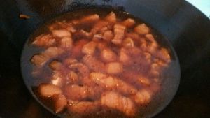 倒入生抽跟老抽翻炒后加水漫过五花肉。先大火煮十分钟,关小火