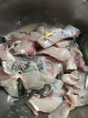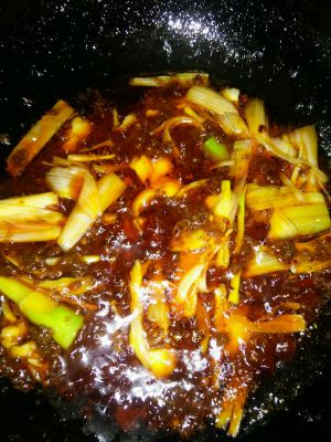 取一口干净的锅,下油,油7分烫下姜片那一堆,然后下鱼调料