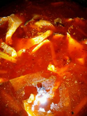 第四步骤,料炒好后倒入凉水烧开后鱼倒入,煮至3-4分种左右放入自己想吃的菜然后辣椒面放进去,在放鸡精,舀至碗中,可放香菜。