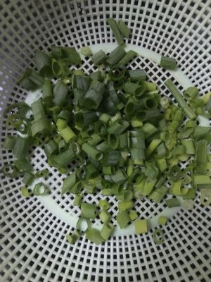 水开了把菜一一烫好铺盆底,水里要加一点盐,菜才会入味,切一点葱花