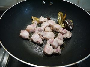 放肉,把肉炒的有些金黄出油之后,加入土豆翻炒一分钟左右