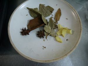 准备辅料:姜 (五片) 桂叶 (4片) 茴香(5g)冰糖 (3-4小颗) 八角 (2-3个)