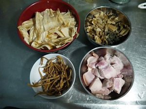 准备材料:腐竹泡水软后切成一个手指长短的距离,梅干泡1个小时后切成小段,笋干手撕成长条,五花肉开水烫过后切成2cm大小的肉块材料,虽然拍出来很简单,但是工程是挺庞大,优先泡梅干。