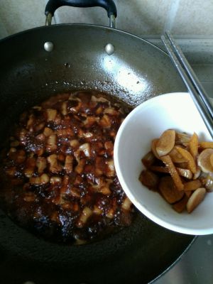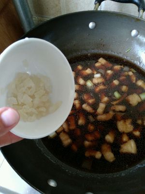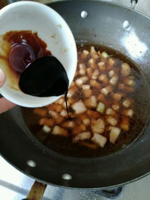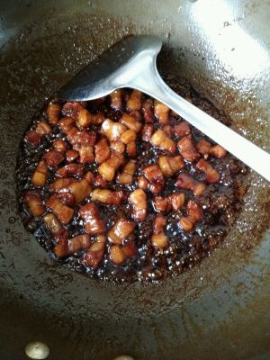 放入上过色的肉、加适量生抽、料酒。翻炒均匀