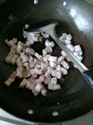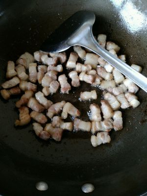锅中放少许油,小火煸香八角,桂皮,干辣椒后放焯水后的五花肉块中火炒至微黄起锅。