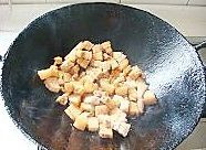 将过水后的肉切成小块,放入锅内煸炒(锅内不放油),把肉炒的有紧凑感,