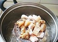 五花肉切麻将块,锅里加水待水稍微加热一下加入五花肉水开后撇一下浮沫捞出备用。