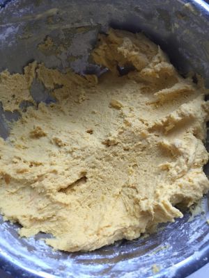 蒸熟的南瓜碾成泥,兑入面粉和成团。