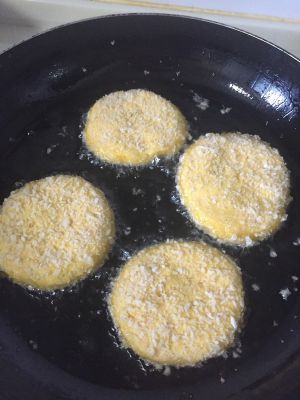 平底锅倒入油,待油温5成热,下饼胚煎炸至两面金黄即可出锅