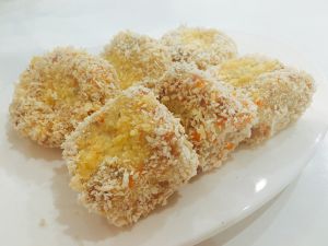 揪一团拍成饼状,裹上蛋液沾上面包糠或者玉米片