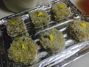 拌好的土豆泥捏成形状,先裹上淀粉,再裹上蛋液,再裹上面包糠。用锡纸包好烤盘,上面刷一层橄榄油,摆入可乐饼,每块上顶块黄油,会比较香。