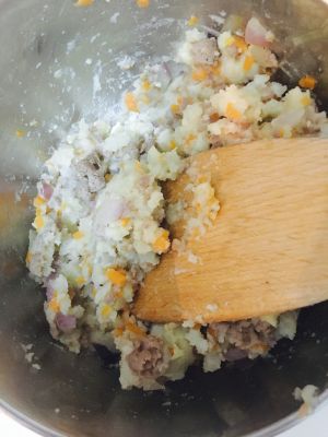 将土豆 肉末 肠仔 洋葱混合 这里我的土豆量太少了 然后粘成饼状 在里面放芝士 放多一点噢