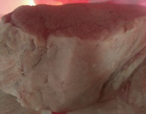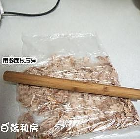 把肉块装在保鲜袋子里,有擀面杖的可以用擀面杖,我家里没有,就用的保鲜膜筒,来回压,把肉块压碎碎的,然后可以再用手撕一下