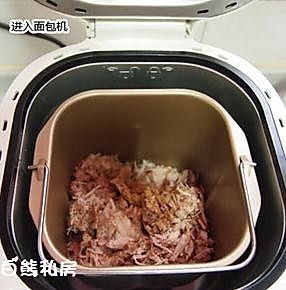 炒的肉丝发黄,移到面包机里,2次和面功能,这样基本要好了