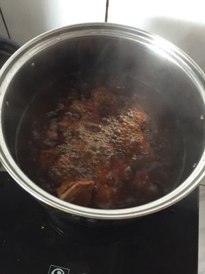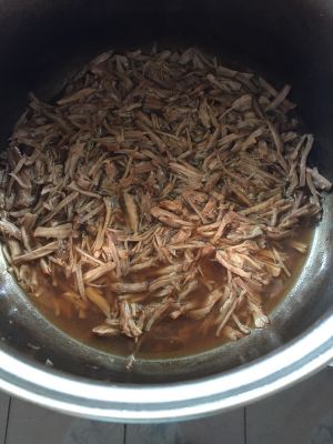 高压锅里大概20分钟左右吧,排完气后把肉另外乘在一个锅子里,加入刚才的卤水,不用全放,和肉块平就好了,然后放点点盐和白糖调味,按照自己口味来,喜欢辣的可以放点干辣椒,继续煮一会,这时候肉块应该是很烂的了,可以用筷子把肉块弄碎一点,这样可以充分入味