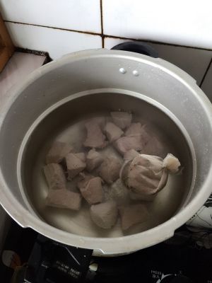 猪腿肉切块,加生姜料酒绰水,然后洗净,把表面的白膜弄干净,然后放入高压锅,加入卤料包,生抽老抽