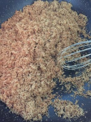 炒锅里加入一点油,放入搅好的肉松翻炒,主要是让肉松收干水份,小火不停翻炒,几下后用打蛋器翻炒,可以让肉松更蓬松一点,小心炒焦了啊