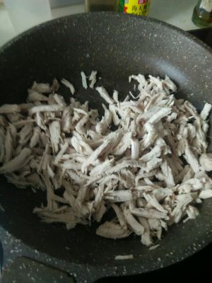 锅里放少许油小火炒大概20分钟,一边炒一边用木铲把肉丝压扁,这是方便水气蒸发。
