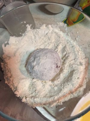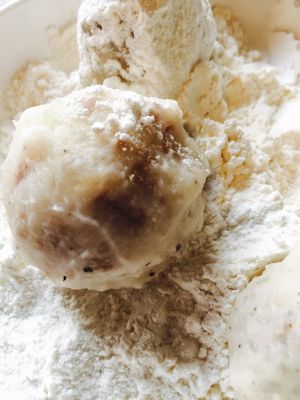 分别准备好材料B,先滚上面粉再滚上蛋液