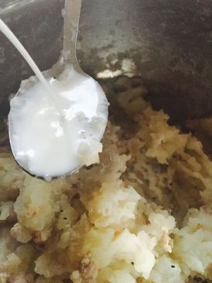 把土豆蒸熟压成泥加入炒好的洋葱和肉馅,再加入一汤匙牛奶拌匀