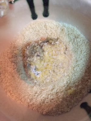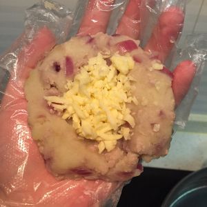 然后抓起一些土豆泥捏紧,窝出一个洞洞后,放入适量的马苏里拉芝士(塞多少就看大家的功底了哈哈!)收好口