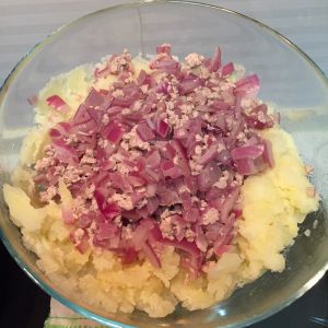 将炒好的洋葱和肉倒入备好的土豆泥中