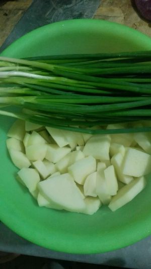 把土豆片切块,用大葱葱段比较好!我这只能用小葱出点香味了~