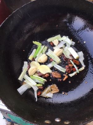 大火上锅,热锅凉油,把之前准备好的葱姜蒜以及辣椒花椒桂皮香叶放进去煸香。