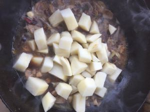 放入土豆,继续翻炒,加入豆瓣酱,个种调味品,调味,倒入适量的酒,添上少许的水!(如果想吃麻辣的,可以多放一点小辣椒和麻椒)