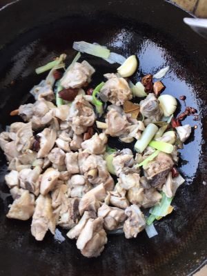 锅中倒油,先把葱姜蒜,大料,小辣椒爆香味,香味出来捞出来!放白糖或冰糖,熬糖色!待糖色出来放入鸡块翻炒上色!