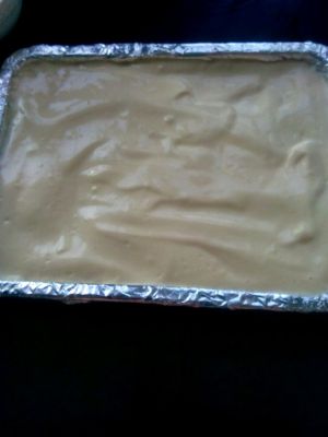 倒在铺了油纸的烤盘里,家里的油纸都被妖怪吃掉了,所以这次用的是锡纸。放入预热好的烤箱,190度上下火烤6分钟,调到150度再烤5分钟。时间和温度视烤箱情况而定。怎么判断蛋糕体熟了没有呢,熟了的蛋糕体表面呈金黄色,摸上去有弹性。