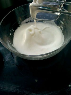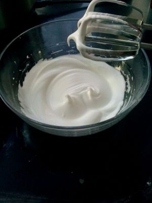 蛋白加入剩余糖粉,低速打发至大泡状态,转高速打发
