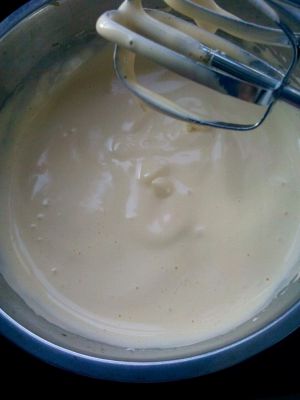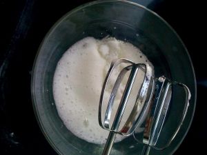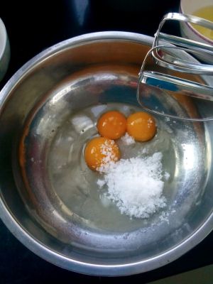 蛋黄、蛋白(1)、细砂糖(1)放在一起,用打蛋器中速打发。