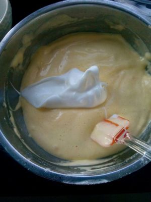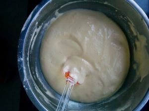 把蛋白霜分2–3部分,加入刚才的面糊中,翻拌均匀。