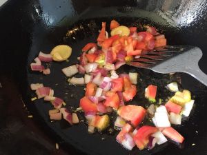 番茄一部分切小丁,一部分切大块,锅内加油,加入姜片爆香,倒入番茄丁炒香,加入番茄酱炒香,烹入料酒,加入番茄块;