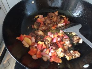 锅中倒油 油热下牛肉粒 翻炒变色以后下洋葱