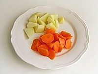 2个小时后放入另一部分番茄块,再放入土豆块和胡萝卜块,并加适量盐调味,继续煮顿,直至蔬菜块变软即可关火