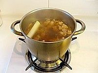 取汤锅,注水适量清水烧开,放入牛腩,再加入料酒,姜片,葱段,少许的酱油,大火煮一会,再转小火盖上锅盖