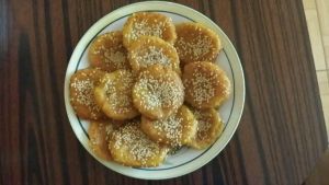 面团软硬适中,饧十分钟后,团成小圆球,手心按成圆饼,撒上白芝麻。为避免粘手,可以戴手套或隔着保鲜袋按饼。