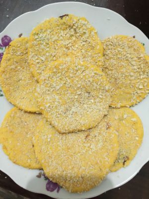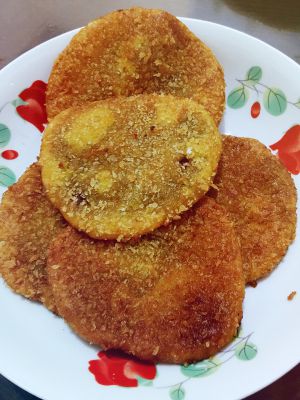 盘里倒入面包糠,将做好的饼放入盘里两边裹上面包糠,全部做好后,吃多少煎多少,一次吃不完用保鲜膜包好放冷冻,下次直接拿出来煎熟就可以