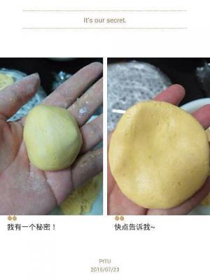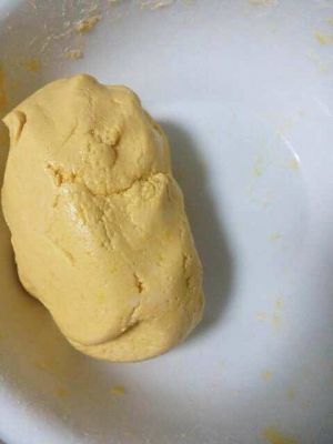 面团如图状(注:南瓜蒸熟后会有少量的水,亲们可以把水先倒到一个小碗里,在加粉揉面团!不然的话需要的粉量会不同的!)