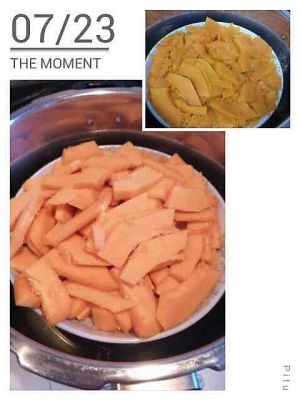 老南瓜去皮切片入高压锅蒸熟(也可以直接放在锅里蒸熟)